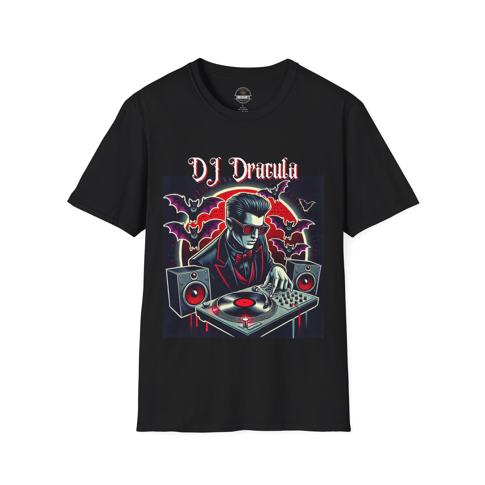 This T-Shirt features a unique design of a DJ as Dracula with turntables, giving off a fun and quirky vibe. It is perfect for music enthusiasts, Halloween lovers, and enthusiasts of unique graphic tees. Great for Halloween parties and casual wear.