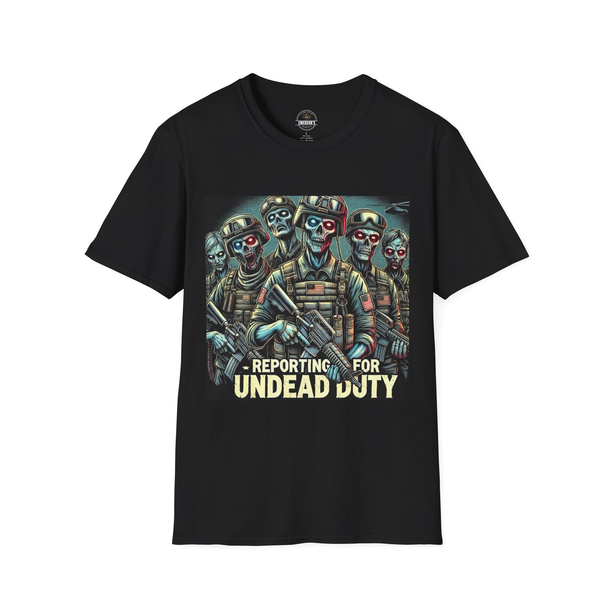 A cool comic-style T-Shirt featuring military zombies in full combat gear with the text 'reporting for undead duty'. This T-Shirt gives off a fun and edgy vibe, perfect for casual wear or to make a statement at a themed party. Ideal for zombie enthusiasts, comic book fans, and Halloween celebrations.