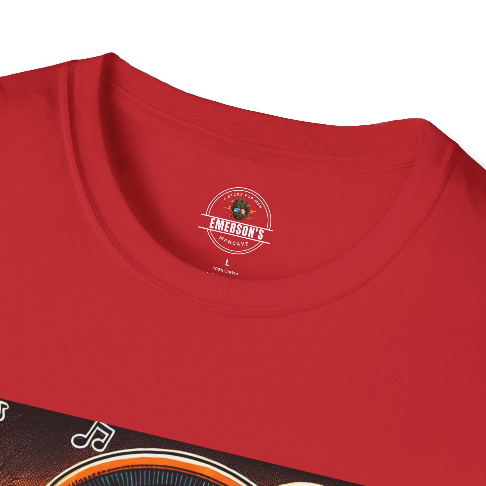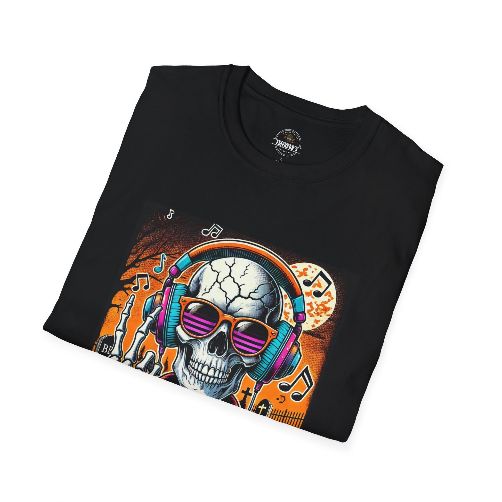 This T-Shirt features a cool skeleton with headphones on listening to music in a cemetery, with cool colors and shades, paired with the text 'Bad to the bone'. It gives off a unique and edgy vibe, perfect for music lovers and those with a playful sense of style. Ideal for Halloween, music festivals, or casual everyday wear.